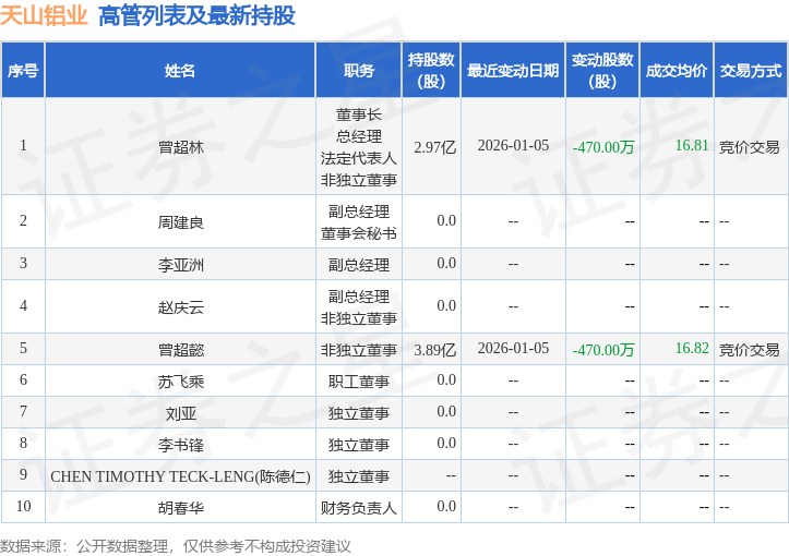 天山铝业的高管列表及最新持股情况如下: